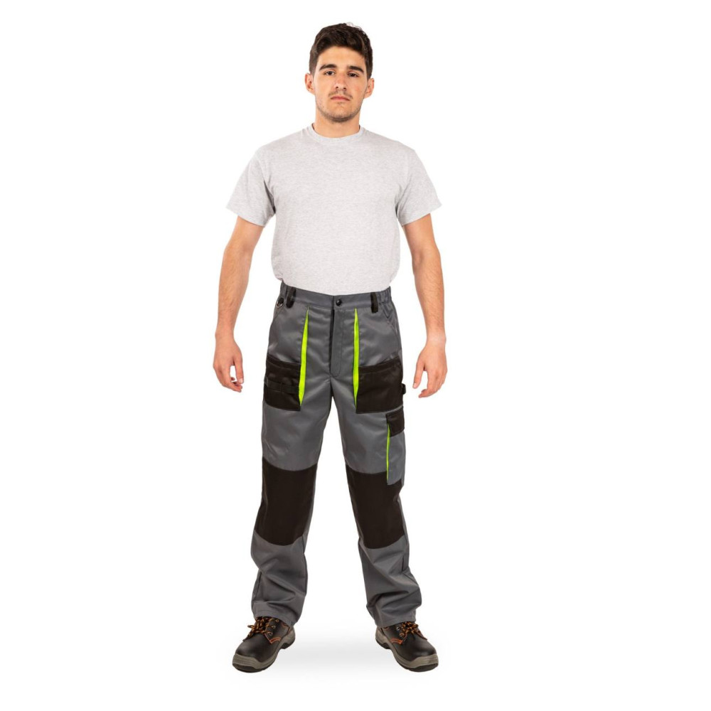 Штани робочі ЕКСПЕРТ НЕО в сіро-чорному кольорі та салатовими вставками.