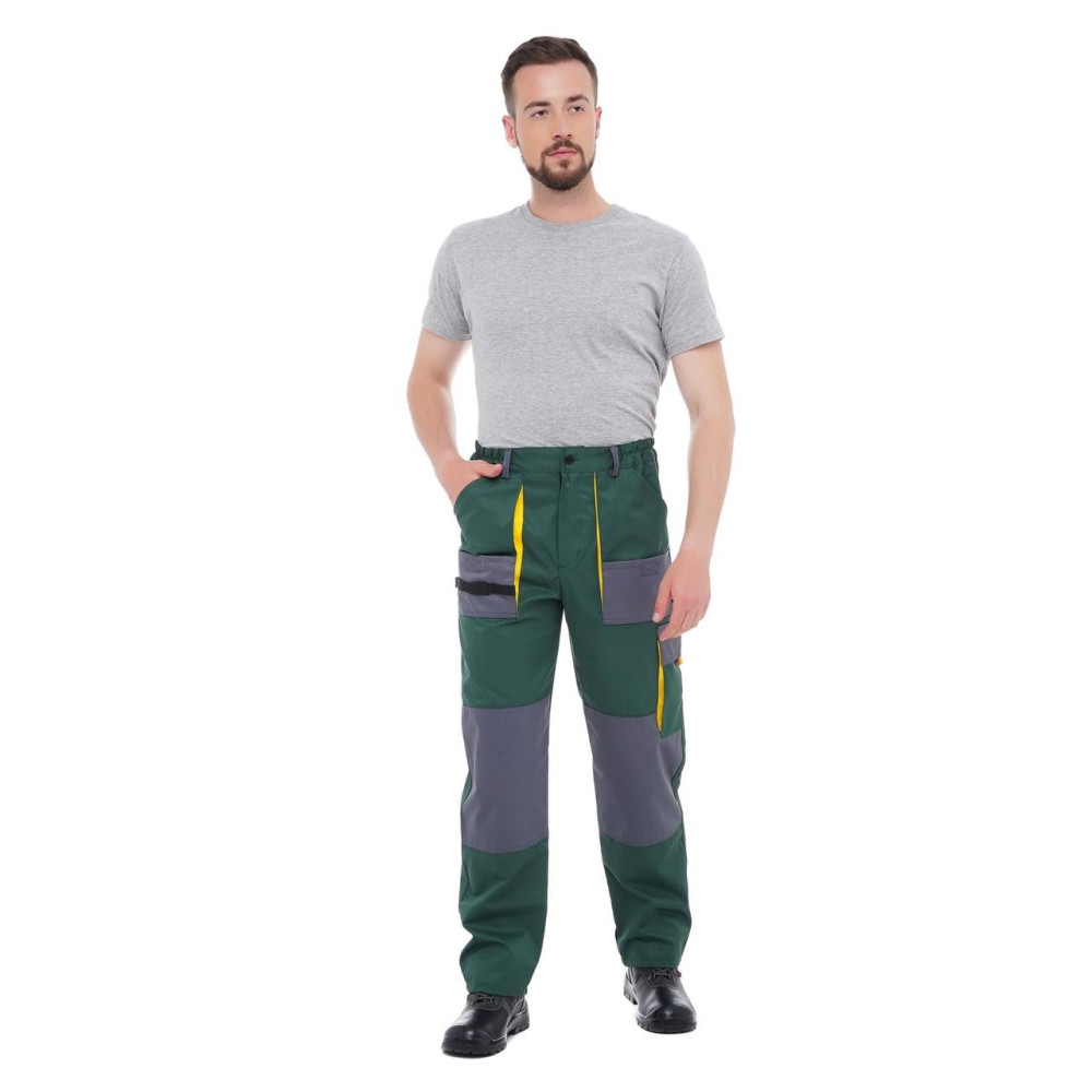Штани робочі ГЕКОН у зеленому кольорі з сірими та жовтими вставками.