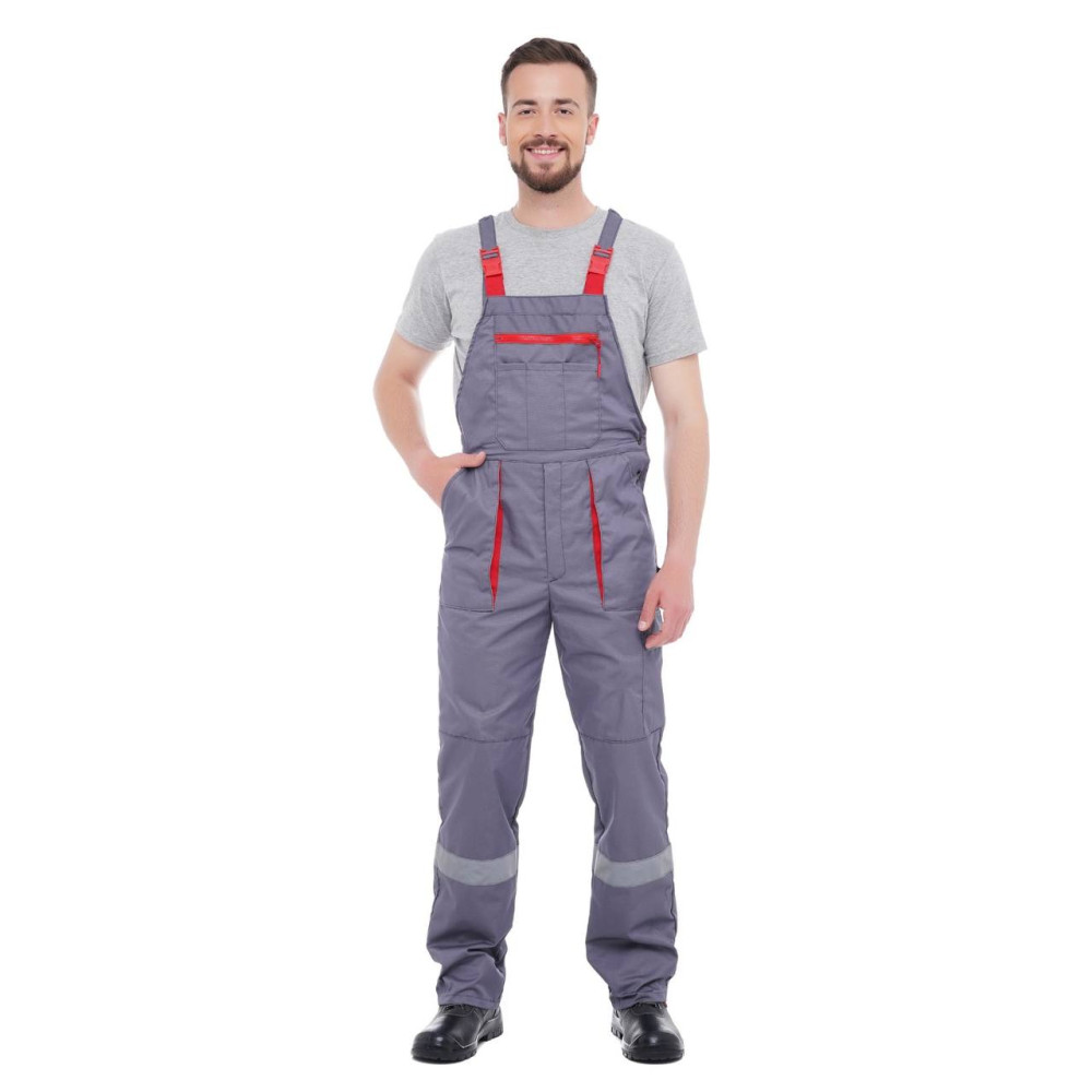 Робочий напівкомбінезон на весну літо осінь CARBON виконаний у сірому кольорі з червоними вставками.