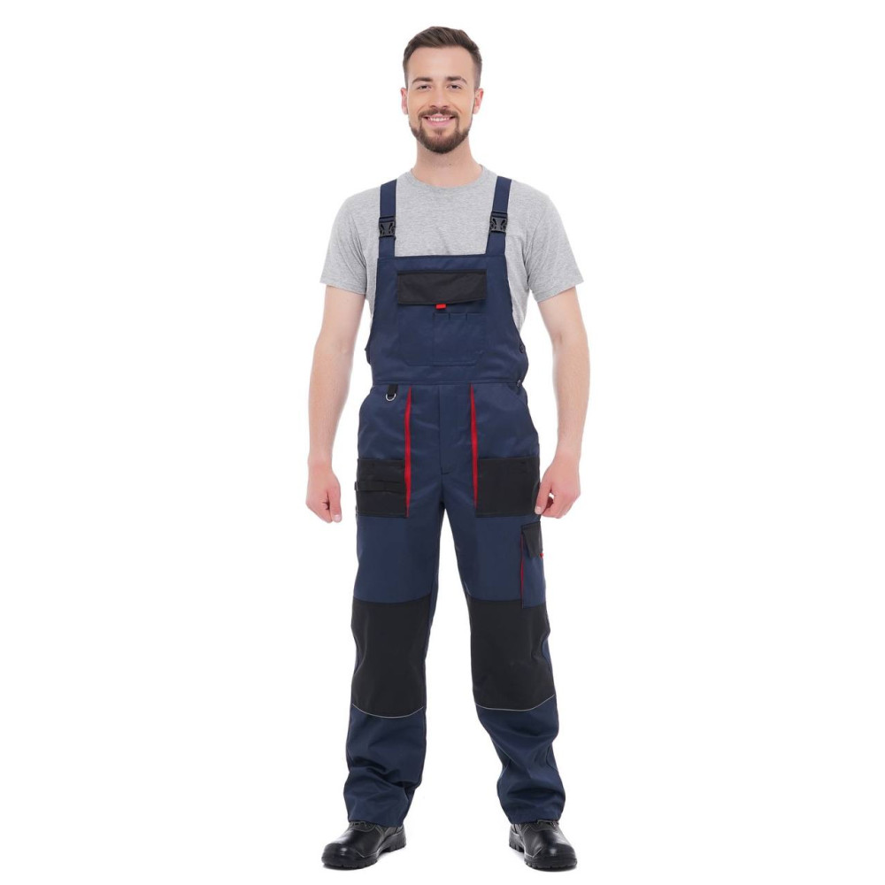 Напівкомбінезон робочий УРБАН у темно-синьому виконанні з червоними вставками і світловідбивними елементами.