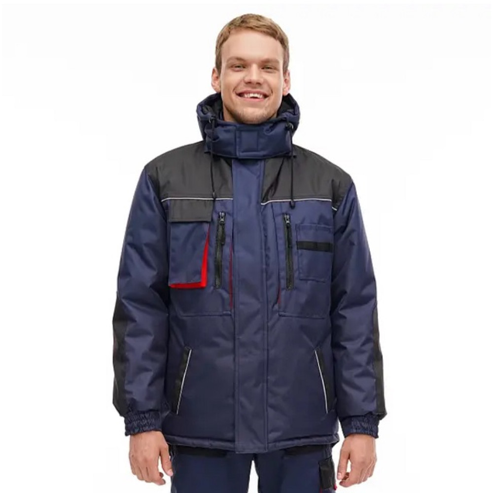 Колір робочої куртки - темно-синій з чорним і червоними вставками.