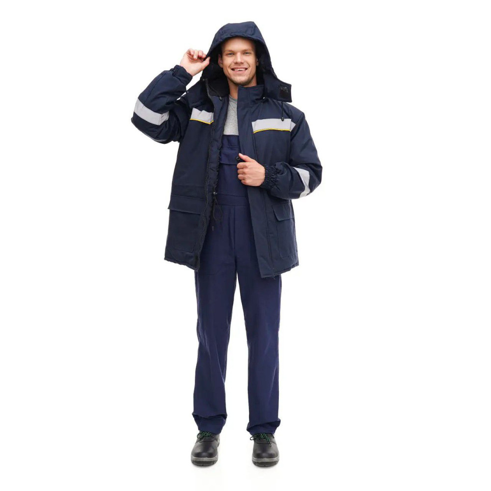 Зимова робоча куртка Комфорт зимова виконана з матеріалу, що має 100% бавовняний склад верху з вологостійким просоченням. Утеплена синтепоном на поліестеровій підкладці. Куртка прямого силуету з центральною застібкою на блискавці і вітрозахисною планкою, комір стійка. Капюшон на блискавці. Рукава з манжетами на еластичній гумці. Куртка має світловідбивні елементи на грудях, спині та на рукавах.
