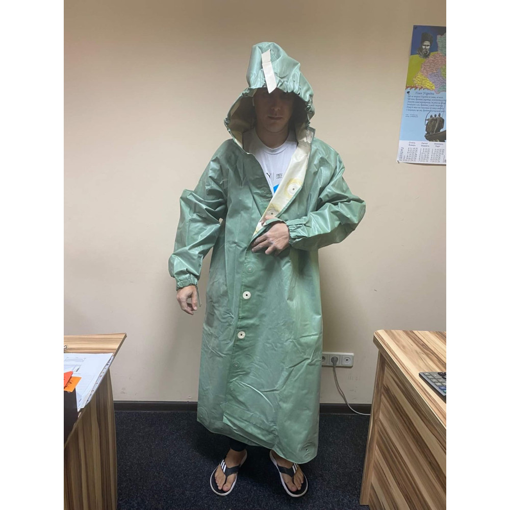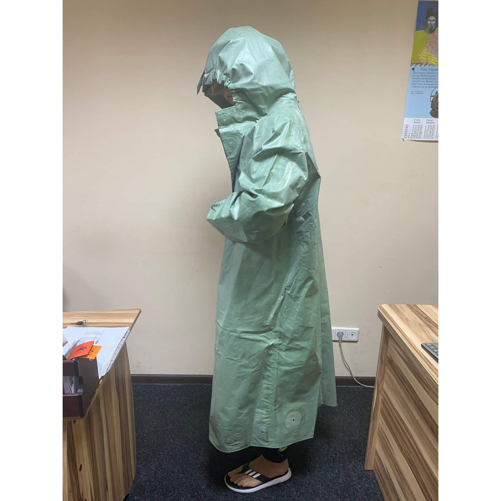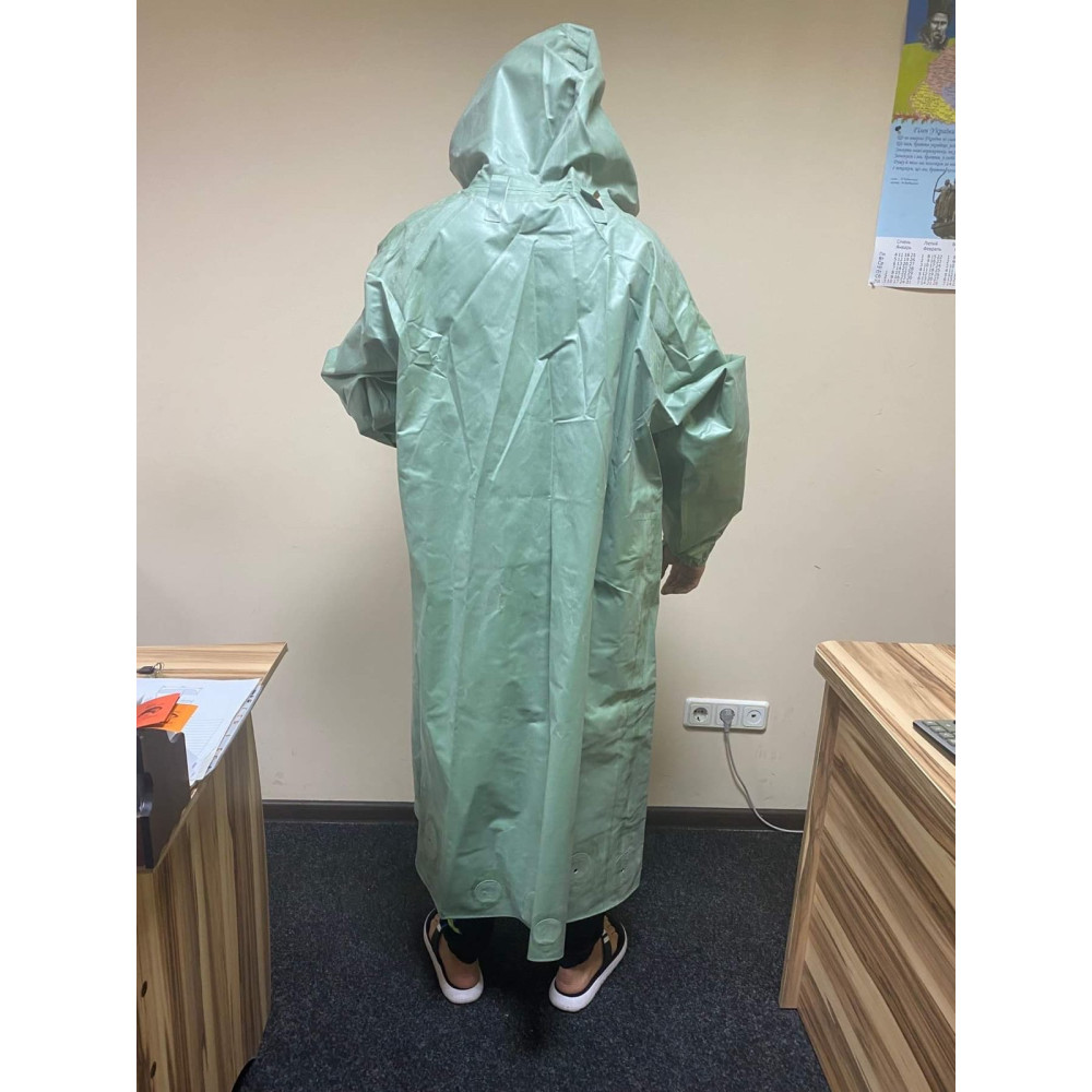 Плащ водонепроникний з прогумованої тканини з капюшоном на ґудзиках.